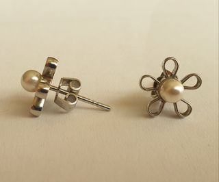 Pendientes Swatch en acero inoxidable y perlas de río. Diametro: 1 cm Ver pulsera a juego.