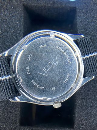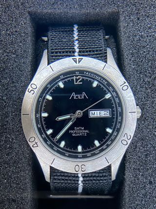 Reloj de pulsera Actua con movimiento de cuarzo japonés y esfera negra. - Bisel con escala taquimétrica. - Indicador de día de la semana y fecha. - Resistencia al agua de 5 ATM. - Correa de tela negra con detalles blancos. Movimiento japonés 🇯🇵 Todo de acero inoxidable. ✅ Tapa roscada. ✅ Pila recién cambiada. ✅ Correa recién cambiada. (Nueva) ✅ Función de día y fecha, 50m Water resist ✅