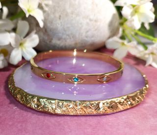 Sin estrenar. Pulsera de acero inoxidable chapada en oro 18K, con ojitos turcos de circonitas de diferentes colores, preciosa. Diámetro: 65mm