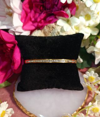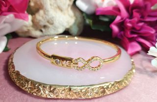 Sin estrenar. Brazalete dorado de acero inoxidable y circonitas transparentes. Se puede abrir por el lateral. Medida en fotos.