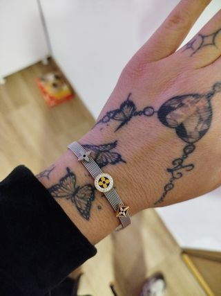 Preciosa pulsera Lotus. Se compone de dos piezas, una con forma de mariposa y la otra con forma de flor. Ambas tienen un diseño elegante y delicado, con detalles en color blanco perla sobre metal plateado. - Diseño de mariposa. - Acero inoxidable - Detalles en blanco perla.