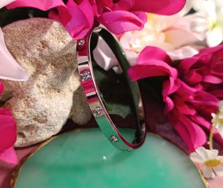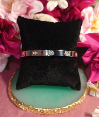 Sin estrenar. Brazalete de acero inoxidable con circonitas transparentes. Se puede abrir. Mide 6 cm de diámetro interno y 4 mm ancho.