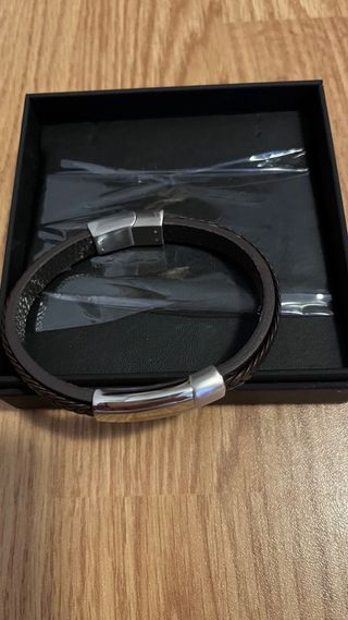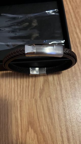 Pulsera de cuero trenzado con detalles en acero,sin usar. - Cierre magnético de acero. - Tres cuentas metálicas cuadradas. - Diseño moderno y elegante