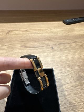 pulsera de hombre de acero dorado de Lotus. pulsera de cuero negra. tiene un pequeño desgaste en el centro.