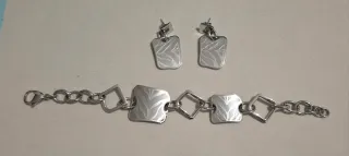 Elegante conjunto de joyería de acero inoxidable. - Pulsera con eslabones rectangulares y detalles brillantes. - Pendientes colgantes a juego con diseño geométrico. - Acabado plateado.