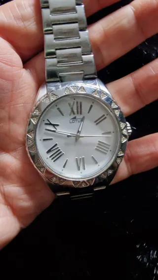 Elegante reloj de pulsera para mujer de la marca Lotus. Su diseño combina sofisticación y estilo. - Esfera con números romanos. - Bisel decorado con pequeños cristales imitando diamantes. - Brazalete de eslabones de acero. Sin pila, hay que ponerle. Es muy bonito. Me costó 90 euros. En el acero, puedes ver en las fotos, se le nota un poquito el uso si lo miras muy de cerca. Mi muñeca mide 18 cm de diámetro. No tengo la caja.
