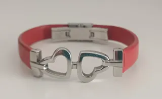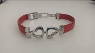 Elegante pulsera de la marca Lotus de acero con un diseño de corazones entrelazados. - Pulsera de piel de color rojo. - Detalle central con dos corazones plateados. - Cierre de seguridad plateado.