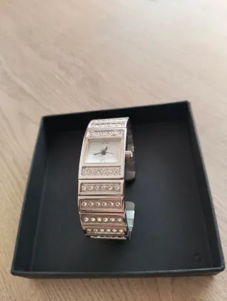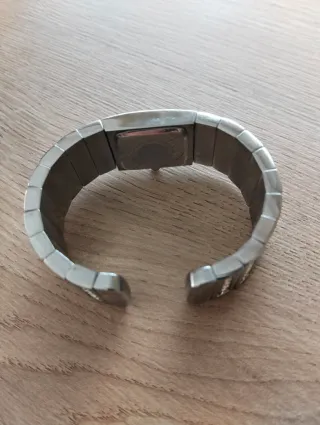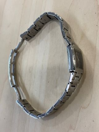 Elegante reloj de pulsera para mujer con un diseño moderno. Ahora se llevan los relojes cuadrados y la pulsera es ancha tipo brazalete). - Brazalete de acero inoxidable. - Perímetro de 16 cm (muñeca pequeña) y no van eslabones para agrandar ( por ello se vende). Va perfectamente y el cierre también. Pequeños arañazos si se mira muy de cerca, de su uso, pero como cualquiera de segunda mano (ver fotos) y ya previsto por el precio. Color plata (acero inoxidable) perfecto (salen reflejos en las fotos).