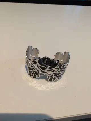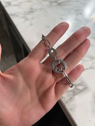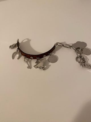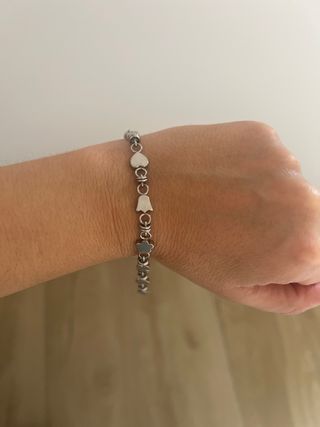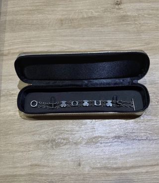 Pulsera inspiración tous de acero. Con signos del uso pero en buen estado. Tiene una pieza diferente ya que se me rompió, lo podéis ver en las fotos. - Diseño con eslabones y un charm central. - Acabado en tono plateado.