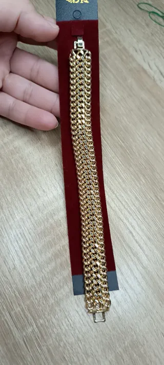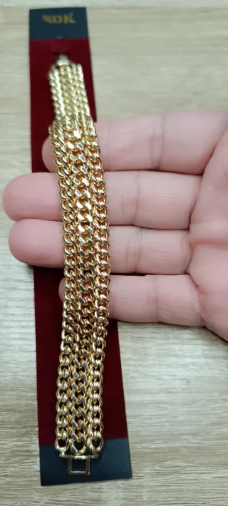 Vendo espectacular pulsera de acero inoxidable (Stainless Steel) con diseño de triple cadena estilo Grumet. Es una pieza de alta gama con un acabado en color oro de gran brillo. ¿Por qué elegir esta pulsera? Material: Acero inoxidable de alta calidad (No se oxida, no pierde el color y es hipoalergénico). Durabilidad: Puedes usarla a diario, incluso en la ducha o con perfume, sin que se estropee. Diseño: Triple fila entrelazada, muy robusta, elegante y llamativa. Estado: Totalmente nueva, con su soporte original. Cierre: Muy seguro y resistente. Ideal para quien busca el lujo del oro con la resistencia y durabilidad del acero.