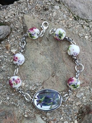 Pulsera en dorado o plateado realizada en acero quirurgico hipoalergenico inoxidable con cuentas cerámicas y cabujon de flores naturales en resina chapado en oro No pierde su color y resiste la humedad.