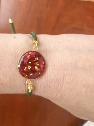 Pulsera hecha con resina sobre un dije circular de acero inoxidable que contiene pétalos de rosa y detalles dorados. - Cuerda ajustable de color verde. - incrustaciones de pétalos de rosa y pan de oro. #resina #artesanal #handmade #hechoamano #joyeria #regalo #pulsera