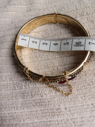 Técnica: Incrustación sobre acero pavonado (fondo negro). Detalles: Diseño floral y geométrico muy detallado, con dos piedras centrales de cristal tallado en color rojo rubí. Seguridad: Cierre de lengüeta muy firme y cadena de seguridad incluida para mayor tranquilidad. Medidas: Diámetro interior de 6 cm (ver fotos con metro). Estado: Impecable, muy bien conservado. El dorado brilla como el primer día y no falta esmalte.El damasquinado es una artesanía milenaria consistente en decorar objetos de acero mediante diseños en oro y plata para obtener creaciones de gran belleza y delicada elaboración. El contraste entre el negro y bri
