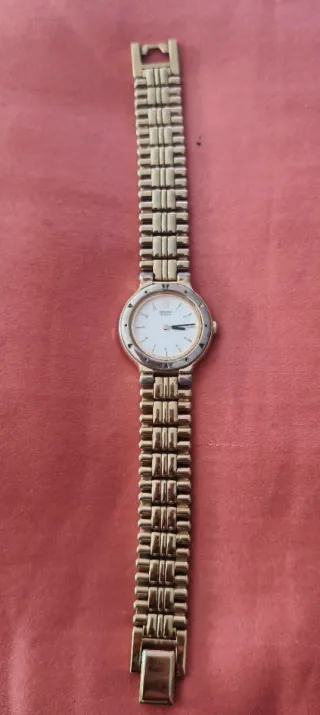 Vendo reloj pulsera Seiko, de quarzo, elegante, vintage y con un diseño bicolor para mujer. El mismo se encuentra en perfecto estado y se vende por falta de uso. Entrego o envío el reloj funcionando y con pila. - Resistente al agua. - Combinación de tonos dorados y plateados. - Brazalete metálico con eslabones. DETALLES. Marca: Seiko Referencia: 220308 Movimiento: Quarzo Esfera: 25mm Color: Esfera plateada y brazalete con eslabones chapado en oro. Materiales: Metal y acero Estado: Buen estado