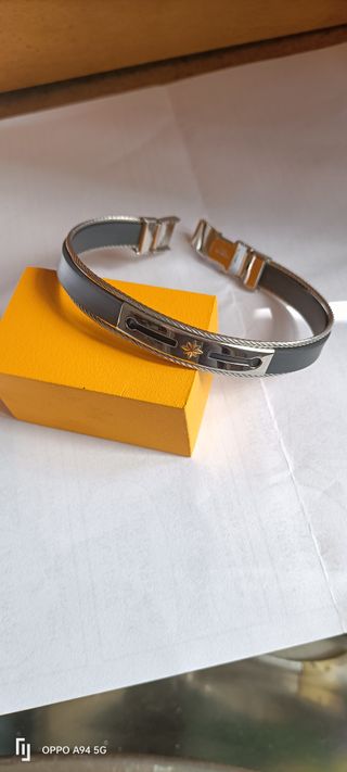 preciosa pulsera en acero de la mejor calidad y anti alergico,adaptable a la muñeca debido a su terminacion co. cierre abierto, piedra de la flor en color grabare claro bordeada con oro de 9 ktes. Nueva , venta de muestrario.