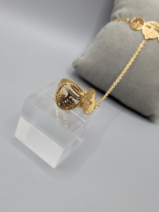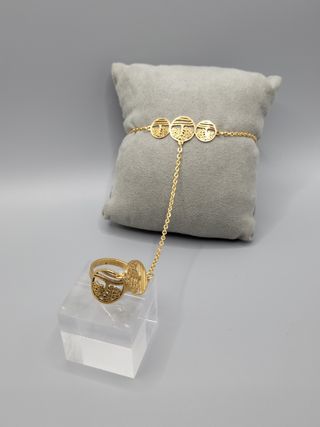 Elegante manita pasamanos con un diseño intrincado. - Acabado en tono dorado. - Incluye pulsera y anillo unidos por una cadena. - Tres adornos circulares con diseño de árbol de la vida en la pulsera. - Anillo con un adorno ovalado a juego. - Acero quirúrgico chapado en oro. - Anillo medida ajustable.