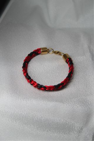 Pulsera con un diseño trenzado y llamativo. - Dimensión aproximada; largo 20 cm; ancho 1 cm - Material: poliester - Colores: rojo y negro - Cierre de acero inoxidable dorado.