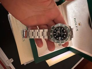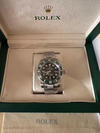Reloj de pulsera con bisel verde y detalles plateados. Un modelo icónico y muy buscado. - Bisel giratorio unidireccional. - Brazalete de acero inoxidable.