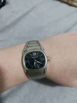 Reloj de pulsera con diseño elegante. - Caja y correa de acero. - Esfera negra con detalles. - Indicadores horarios en números romanos.