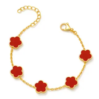 Elegante pulsera Prado de Flores con un diseño delicado. - Fabricada en acero inoxidable. - Adornada con cinco motivos florales en color rojo. - Cadena dorada ajustable. Impermeables e hipoalergénicas. El baño es duradero y no se deslustra