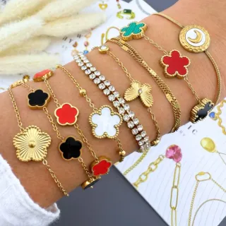 Elegante pulsera con motivos de tréboles. Es de acero bueno, no deja marca verde en la piel - Diseño de tréboles negros. - Cadena y cierre en tono plateado. - Detalle de cinco tréboles.