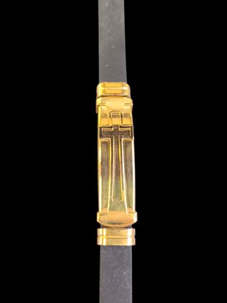 Elegante pulsera con detalles en acero y baño de oro de 18 quilates. - Diseño moderno con caucho negro. - Acabados dorados de alta calidad.