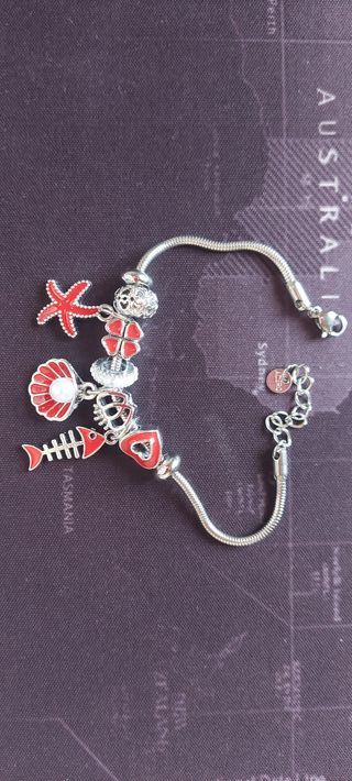 Pulsera con diferentes Charms, ❤️ estrella de 🐚 🐟 ..Sin estrenar. Es de acero lo pone en la chapita que lleva.