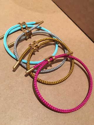 Conjunto de cuatro pulseras con detalle de la H. - Cuerda trenzada en varios colores. - Cierre y detalle central en acero dorado. - Nuevas, sin estrenar.