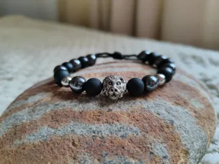 Elegante pulsera con un diseño de león y cuentas de piedras naturales. - Cuenta con un detalle central de cabeza de león. - Combina cuentas negras mate y cuentas plateadas en acero inoxidable. - Cierre ajustable. Incluye una caja de regalo Solo hago envios