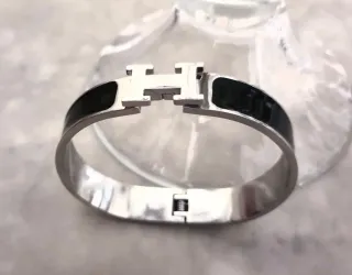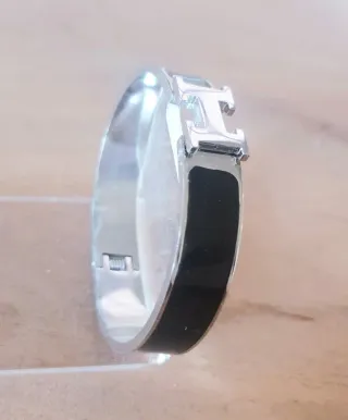 - Acabado plateado brillante. - Detalle central en forma de H con esmalte negro.