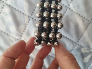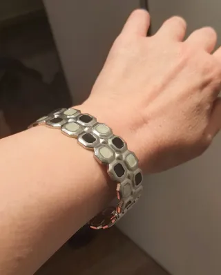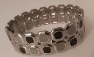Pulsera con piezas hexagonales intercaladas, en negro y gris. Usada en pocas ocasiones. Muy bien conservada. Medidas en las últimas fotos. La marca no es real pero la aplicación obliga a poner una. No tiene marca comercial, se compró en una tienda de bisuteria.