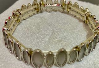 Elegante pulsera de acero inoxidable con un acabado dorado brillante. Está adornada con pequeñas circonitas que añaden un toque de luz. - Material: Acero inoxidable - Diseño: Pulsera rígida - Adorno: Circonitas incrustada (Se aceptan ofertas)