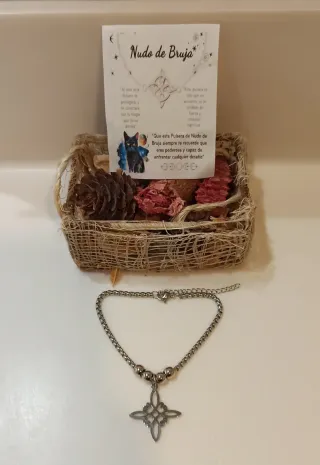 * El Nudo de las Brujas es un amuleto cargado de profundo simbolismo místico. La figura recuerda Los cuatro brazos de la cruz están vinculados con los principales elementos de la Magia Natural: los cuatro elementos (Agua, Fuego, Tierra, Aire) y las cuatro direcciones cardinales (Norte, Sur, Este y Oeste). * Los accesorios son fabricados en Acero inoxidable de alta calidad. No pierde el brillo, no causa irritación a la piel y no se oscurece. * Pulsera ajustable es una pieza fina y delicada con un grosor de 2 mm, con un dije de nudo de bruja de 15 mm. Se vende con la Leyenda de su Simbología. Precio Cerrado.