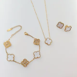 Elegante conjunto de joyas con diseño de trébol. - Incluye pulsera, collar y pendientes. - Detalles en circonitas. - Acabado dorado. -1×15€ y 3x35€