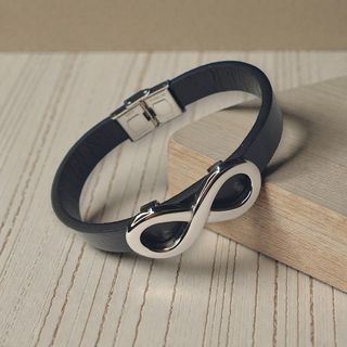 Elegante pulsera con diseño de infinito, mide 1,5 cm. x 22 cm. de largo - Material: Cuero y acero inoxidable. - Cierre de seguridad. Entregamos en mano o enviamos.