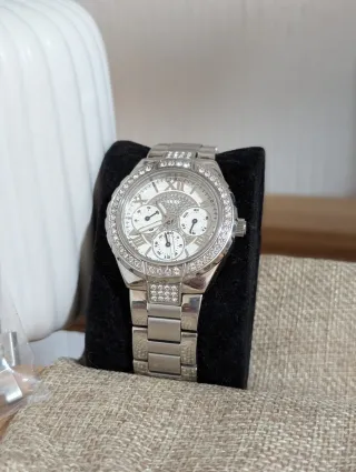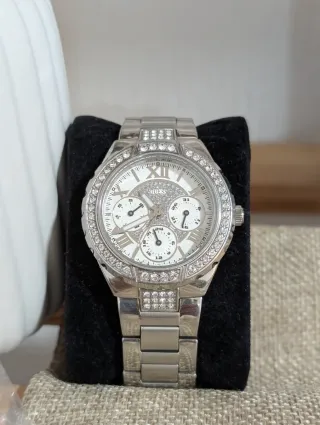 Elegante reloj Guess con detalles de cristales y pulsera de acero. - Esfera blanca con números romanos. - Tres subesferas para funciones adicionales. - Bisel adornado con cristales brillantes.