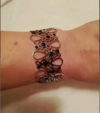Elegante pulsera de la marca Swatch. Ideal para regalar, está en perfecto estado y se adapta a todas las muñecas ya que lleva varios eslabones Es de acero con lo cual no se pone fea Color plata con detalles esmaltados en negro Entrega en zona de Aluche o envío por wallapop No Rebajo - Diseño calado con motivos florales. - Detalle de pequeñas piedras negras. - Acabado en acero plateado.