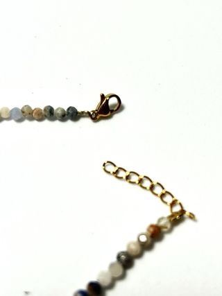Pulsera con un diseño único y elegante, elaborada con acero inoxidable y minerales. - Cuenta con una piedra central de lapislázuli. - Cierre de mosquetón dorado. - Cadena ajustable -medida: 9cm. Tags: minerales, cristales, geoda, cuarzo rosa, amatista, malaquita, turmalina, cuanco tibetano, tarot, palo santo, incienso, nudo de bruja, tetragramaton, radiestesia