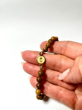 Pulsera con medalla de San Benito y cuentas de jaspe. - Medalla acero de San Benito. - Cuentas de mineral jaspe 6mn. - Goma de buena calidad.