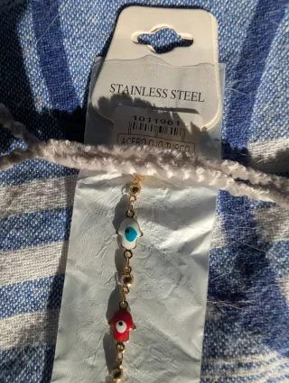 Pulsera con varios dijes de ojo turco (Nazar) en forma de mano de Fátima. - Fabricada en acero inoxidable. - Dijes de colores variados: blanco, rojo, turquesa, morado y amarillo. El ojo turco (Nazar) se usa para protegerse de energías negativas (todo lo ve) y para atraer la suerte. La mano de Fátima simboliza la fuerza contra el mal. (Doble protección)