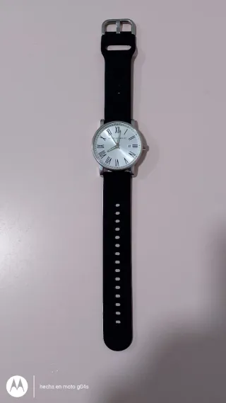 Reloj de pulsera con diseño clásico y elegante. - Esfera plateada con números romanos. - Correa de silicona negra. - Cierre de hebilla.
