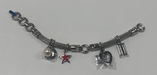 Pulsera de acero con varios abalorios decorativos. - Diseño de oso. - Charm de corazón. - Abalorio de cristal. - Barra con incrustaciones.