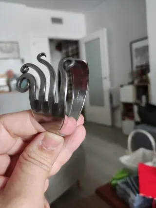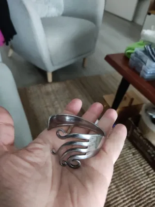 Original pulsera hecha a mano con forma de tenedor. Un accesorio único con un diseño llamativo. - Fabricada en metal plateado. De acero inoxidable. - Diseño con puntas curvas y espiraladas.