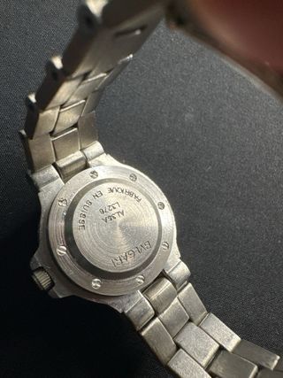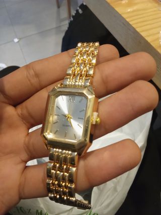Movimiento de **cuarzo suizo** confiable y **con función de fecha**. - **Diseño Elegante:** Esfera **blanca** clásica y legible. Pulsera de acero con **centro de eslabones chapados en oro**, un toque sofisticado. - **Resistente:** **Hasta 50 metros (5 ATM) de resistencia al agua** para uso diario. - **Estado Excepcional:** En estado **general del 90% nuevo (9/10)**. **¡La película protectora trasera ORIGINAL aún está puesta y sin quitar!** Muy bien cuidado. - **Procedencia Especial:** Adquirido en una **subasta de relojes en Japón**. Un reloj de lujo accesible, listo para usar desde el primer día. Perfecto para uso diario o como re