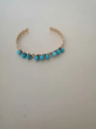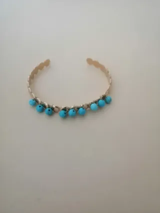 Elegante pulsera de acero con detalles de turquesas. - Diseño abierto. - Adornada con pequeñas cuentas de turquesa. - Acabado plateado.