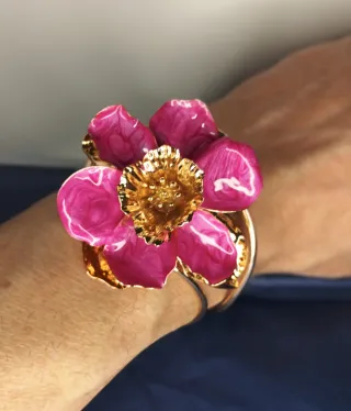 Elegante brazalete con diseño de flor abierta. - Fabricado en acero inoxidable laminado. - Detalles en color dorado y rosa vibrante.