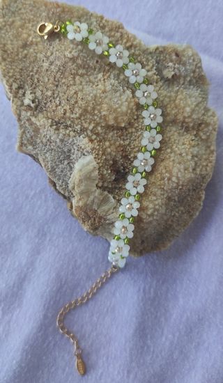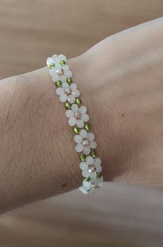 Pulsera de margaritas con abalorios y cuentas de cristal. Cierres de acero. Medida: 15-20 cm. Nueva. Hago envíos combinados, más artículos en mi perfil.