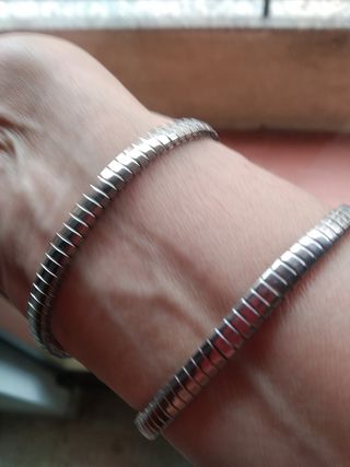 Bonitas pulseras elásticas, creo que son de acero, no se ponen feas ni mojándolas. Las vendo las dos juntas por 5 euros un auténtico chollo.