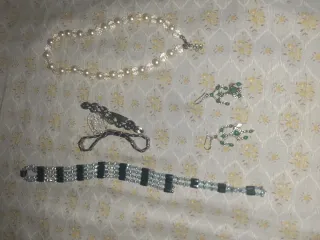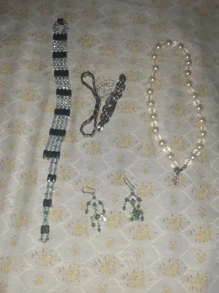 Este conjunto de joyas incluye un collar, unos pendientes y una pulsera. Los accesorios presentan un diseño elegante con detalles en verde y plateado. Lote fantasía compuesto por 2 pulseras de acero inoxidable, 2 pendientes, collar y anillo haciendo juego con el collar. - Collar con cuentas. - Pendientes colgantes. - Pulsera con cuentas y detalles metálicos.
