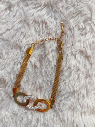 Elegante pulsera de acero con un diseño moderno y brillante. - Acabado en tono dorado. - Detalles de circonitas incrustadas. - Cierre de mosquetón con cadena de ajuste. - Material: Acero inoxidable.